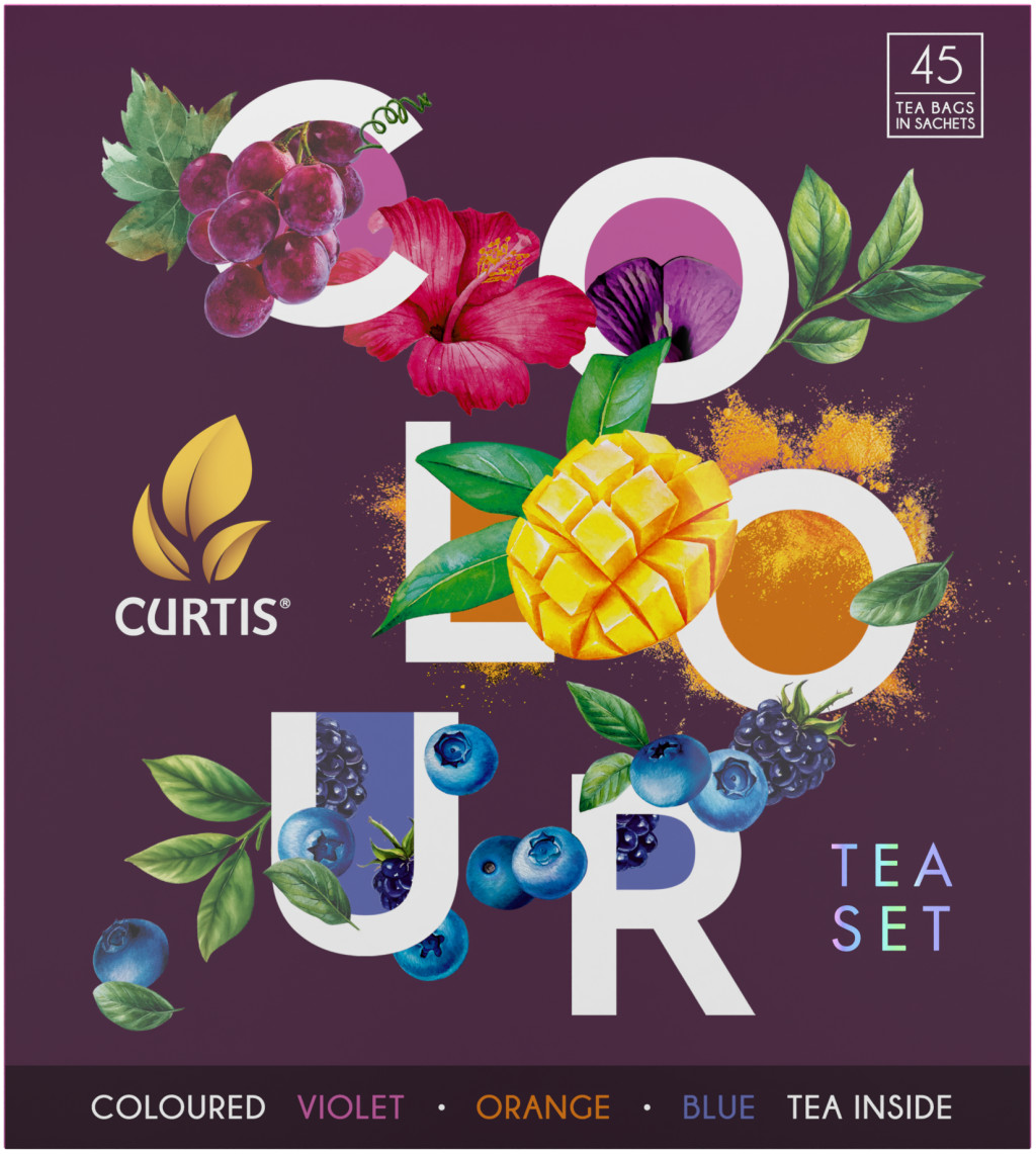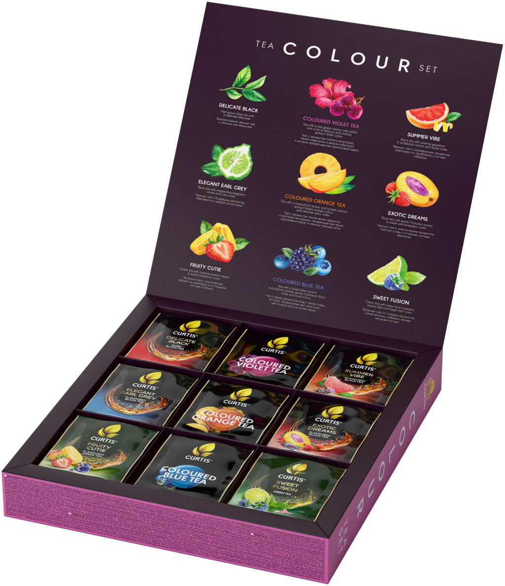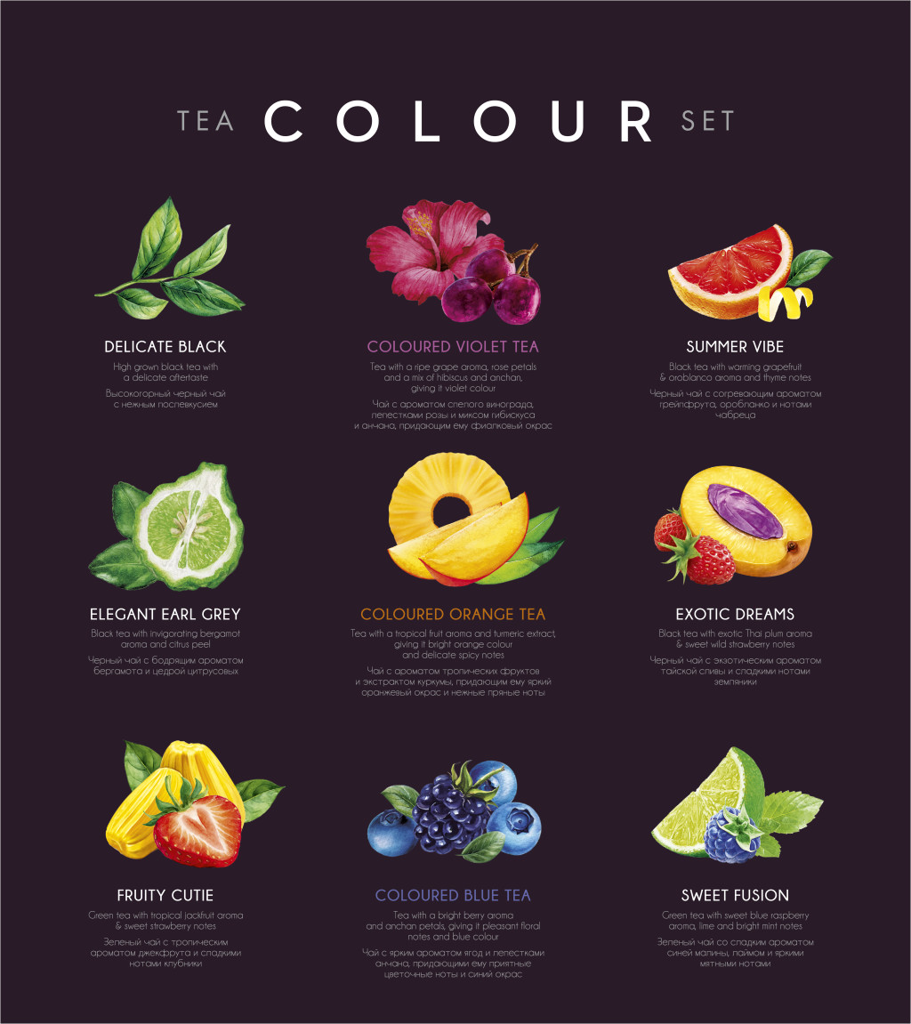 A készletben a sokoldalú fekete és zöld tea ízek mellett 3 egyedi színezett tea is megtalálható - narancssárga (mangó aromával), lila (szőlő aromával), kék (bogyós gyümölcs aromával). Teljesen természetes összetevőkkel színezve: - anchan virág, hibiszkusz, kurkuma.